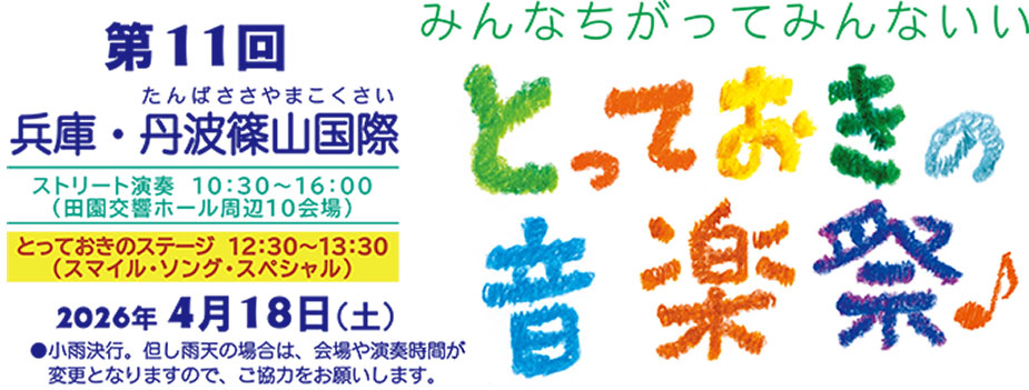 会場予定地 各会場の2023年第8回のショートムービーをご覧いただけます。 会場名をクリックしてください # 旧小島うば車店会場は昨年は開催がありませんでした 田園交響ホール西側駐車場 田園交響ホール玄関 丹波篠山市役所第2庁舎前広場 大正ロマン館中庭会場 大手前南駐車場会場 日本キリスト教団篠山教会会場 円応教篠山教会会場 青山歴史村中庭会場 田園交響ホール会場